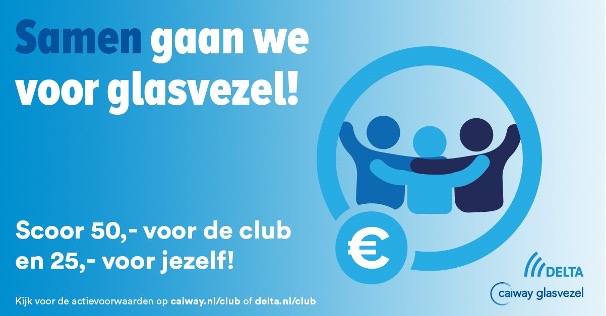 Ga jij ook voor glasvezel? Meld je dan aan via de club! Dan verdien je € 25 voor jezelf en € 50 voor de vereniging! En dat kunnen we heel goed gebruiken, bijvoorbeeld voor nieuwe tassen, opleidingen voor trainers en een BHV-cursus.